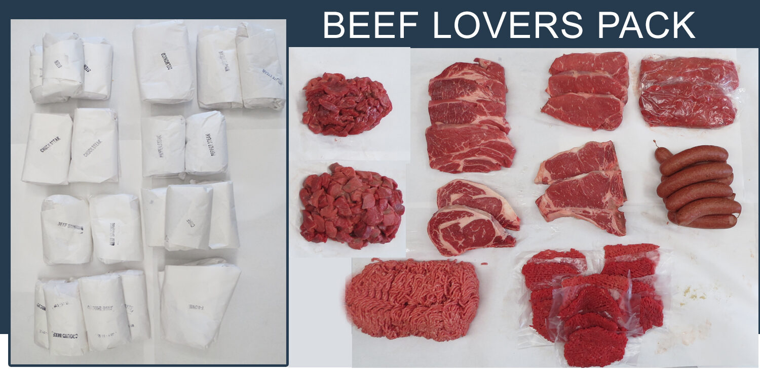2lbs. T-bone Steak 2lbs Delmonico Steak 2 lbs. Filet of Sirloin 3lbs Chuck Steak 5lbs Lean Ground Beef 3lbs Cube Steaks 2lbs Minute Steaks 3lbs Stew Beef 2lbs Beef Sausage 2lbs Pepper Steak